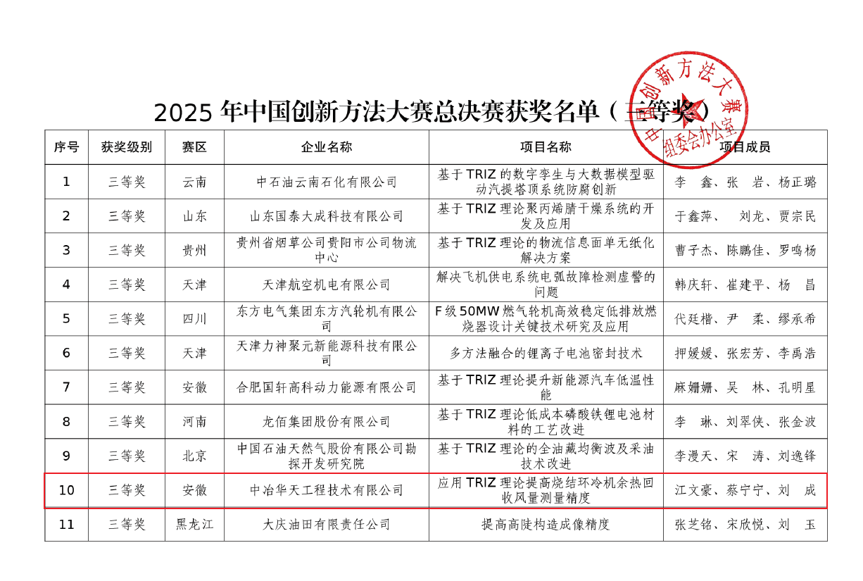 11月17日至21日,2025年中國創(chuàng)新方法大賽全國總決賽在山東泰安和濟南舉辦,中冶華天參賽作品《應(yīng)用TRIZ理論提高燒結(jié)環(huán)冷機余熱回收風(fēng)量測量精度》斬獲三等獎,充分展現(xiàn)了華天積淀深厚的創(chuàng)新底蘊和華天員工昂揚奮進的創(chuàng)新風(fēng)采。