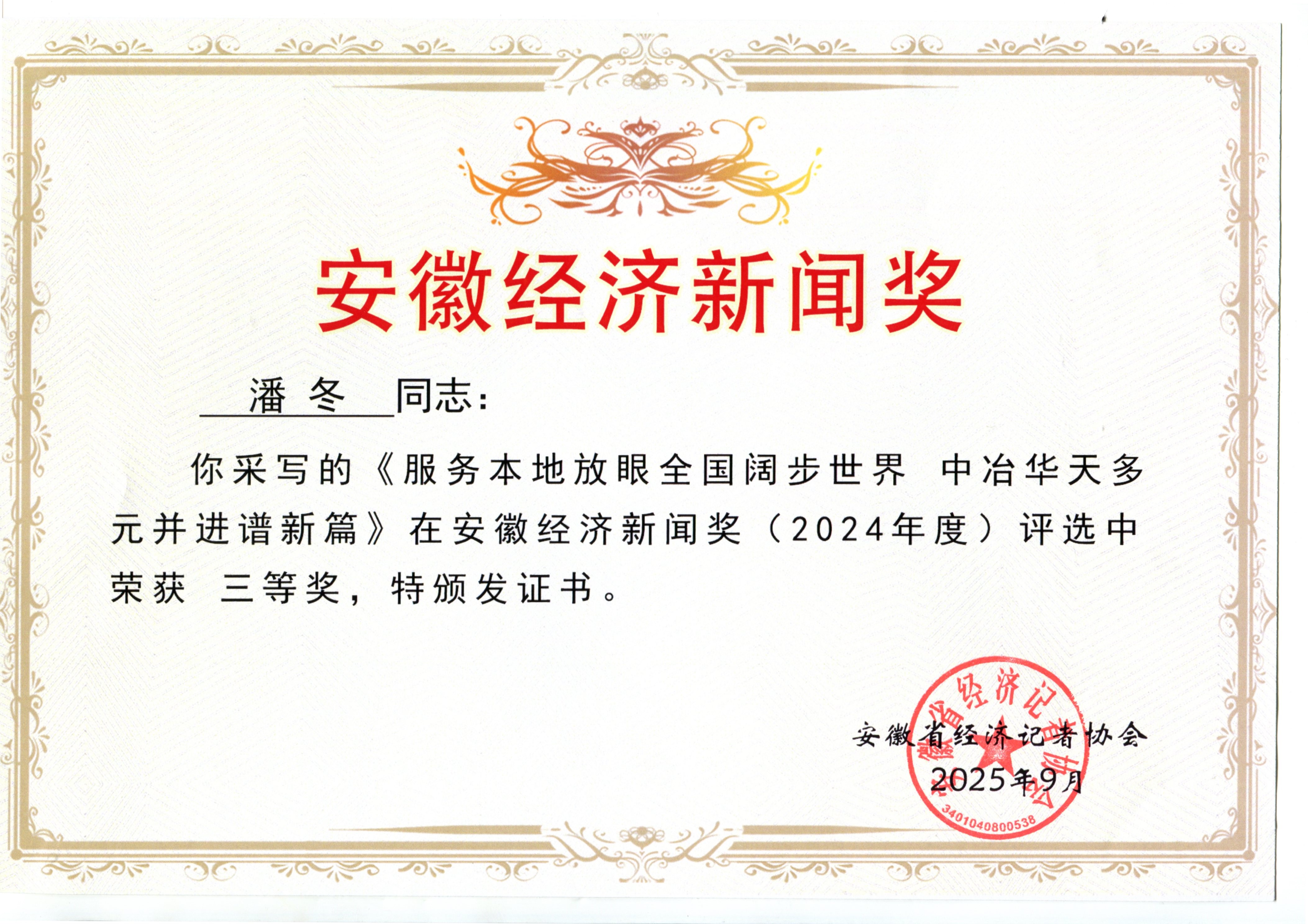 近日,中冶華天收到安徽省經(jīng)濟(jì)記者協(xié)會(huì)頒發(fā)的獲獎(jiǎng)證書,由公司黨群工作部(黨委宣傳部)員工潘冬采寫的新聞稿件《服務(wù)本地放眼全國闊步世界 中冶華天多元并進(jìn)譜新篇》獲評安徽經(jīng)濟(jì)新聞獎(jiǎng)三等獎(jiǎng),有力彰顯了公司推動(dòng)再轉(zhuǎn)型再升級的最新成績和用心策劃宣傳的積極作為,是對其高質(zhì)量發(fā)展實(shí)踐與品牌傳播成效的雙重肯定。